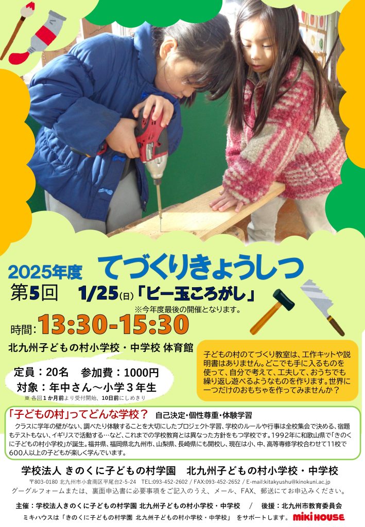 対象は年中さんから小学3年生です。今回は釘やとんかち、のこぎりなど本格的な道具を使ってビー玉ころがしをつくります。入学や転入をお考えの方は、ぜひご参加ください。